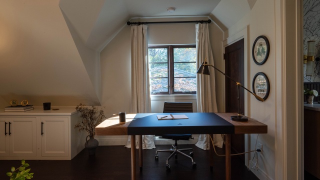 The carriage house apartment from a 1930s Tudor Home in East Grand Rapids, Michigan gets the Jean Stoffer touch as she converts a long-dormant and unused space into a cozy spot perfect for guests and home office use.
