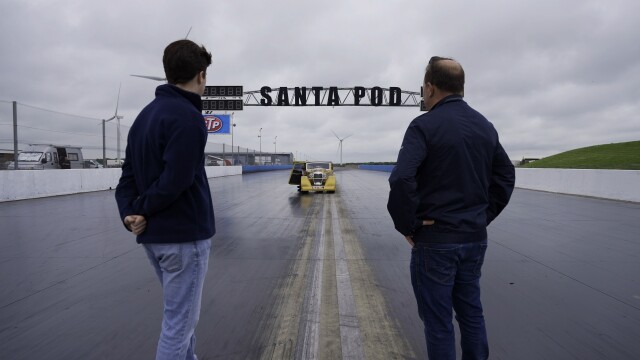 At Santa Pod raceway, engineer and driver Jon Webster reveals the final Flying Kestrel to Joel; Nigel McNully he gives them a tour around the finished car and shows them all the changes he has made to hopefully get a land speed record.