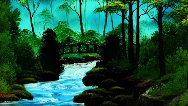 Bob paints a woodland scene complete with a small footbridge running across a creek.