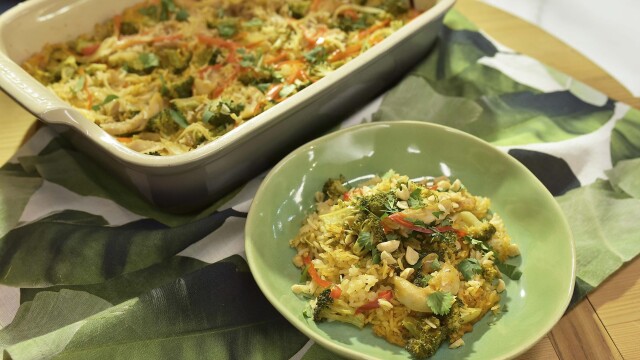Recipes to warm up winter nights include Sunny Anderson's beef Wellington casserole, Geoffrey Zakarian's baked sweet potato and carrot gratin, Jeff Mauro's lemon chicken and orzo casserole, and Katie Lee's spicy Thai red curry chicken casserole.