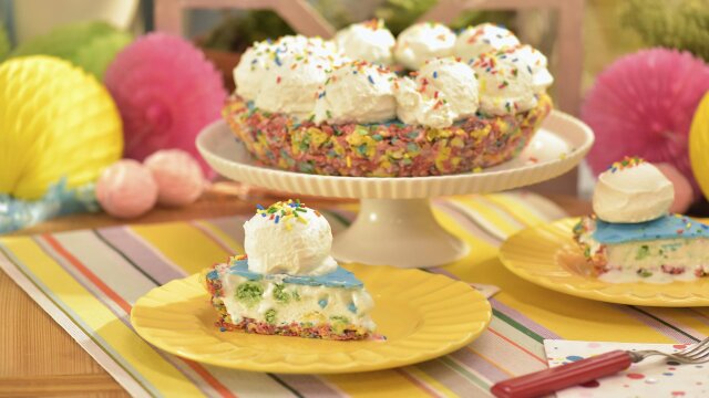 Katie makes porterhouse steak with herb fries; Geoffrey's shrimp bruschetta and Sunny's mini pita pizzas prove to be fun finger foods for any occasion; baker Melissa Ben-Ishay creates birthday magic with a tie-dye birthday cake.