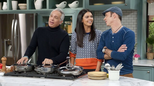 Guest Brian Boitano makes rigatoni with spicy chicken sausage; Jeff Mauro's dish uses three ingredients from the freezer; Geoffrey mixes an icy orange cosmo; Sunny makes spicy mac and cheese.