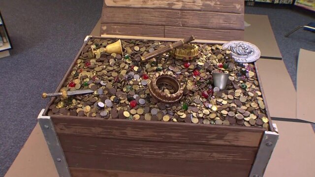 Steve adopts a bad pirate accent while working with Katie on making a giant chocolate treasure chest full of booty for a children's book club.