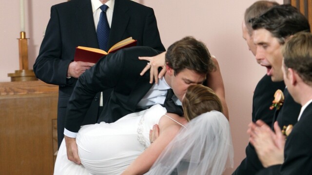 The office mates travel to Niagara Falls to celebrate Jim and Pam's wedding; Michael, Dwight and Andy want to hook up with wedding guests; Jim lets a secret slip at the rehearsal dinner.