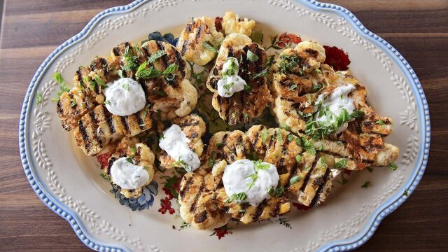 Ree Drummond gives classic dishes a lighter spin, starting with spice-rubbed grilled cauliflower steaks and fully loaded lightened up nachos; she also makes a platter of mushroom "cheesesteak" lettuce wraps and garlic mashed potatoes.