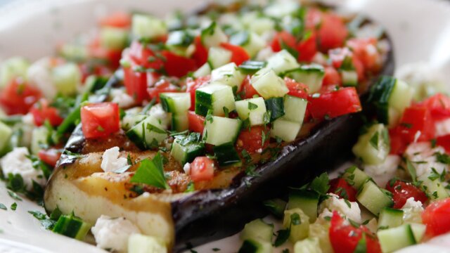 Ree Drummond stocks her kitchen with the ingredients for some of her favorite meatless meals; she whips up broccoli cheese baked potatoes, Greek grilled eggplant steaks, roasted vegetable panzanella, Italian cornbread, and tofu lettuce wraps.