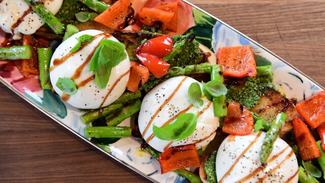Ree Drummond celebrates a new season with a spring dinner that starts with burrata and spring vegetable toast; roasted pork tenderloin with bacon jam, a cheesy crispy noodle casserole and individual lemon raspberry cakes.