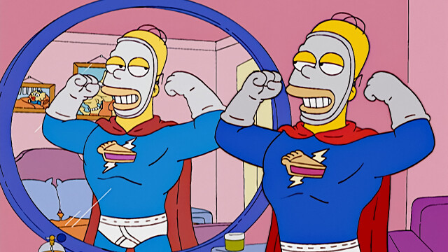 Homer confronts Springfield's evildoers in the form of his crime-fighting alter ego, the Pie Man.