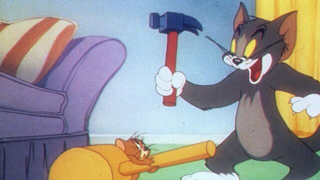 Tom chases Jerry around a construction site.