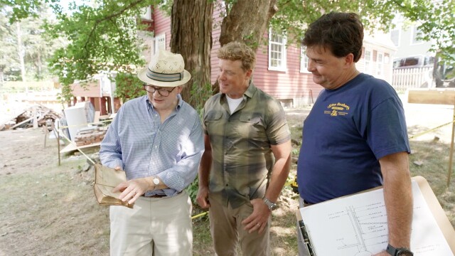 Preparation begins for the new foundation; a centuries-old cistern is uncovered; assessing the original timber frame structure; the original floorboards and roof sheathing are salvaged for later use; inspecting the sill for water damage.