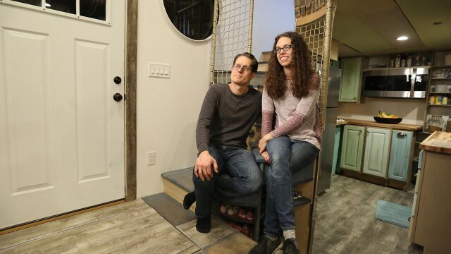 High school sweethearts build a tiny home with a nautical design that is a cross between steampunk and fantasy; it features a reclaimed metal exterior, porthole windows, an octopus-sculptured shower, a dragon mural, and a sky tunnel between lofts.