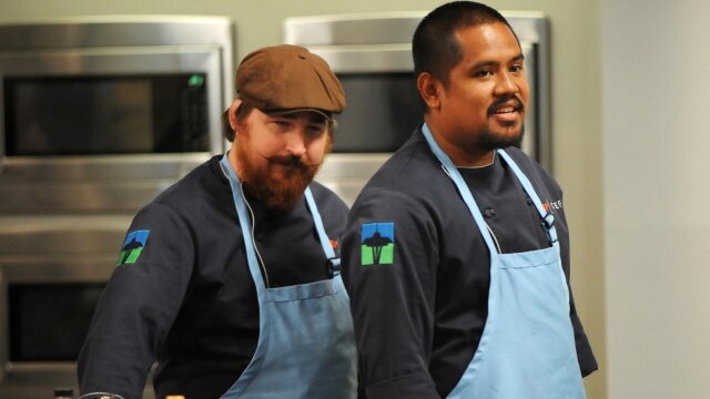 The cheftestants harvest oysters and serve them to Emeril Lagasse; cooking for a Seattle sports team.