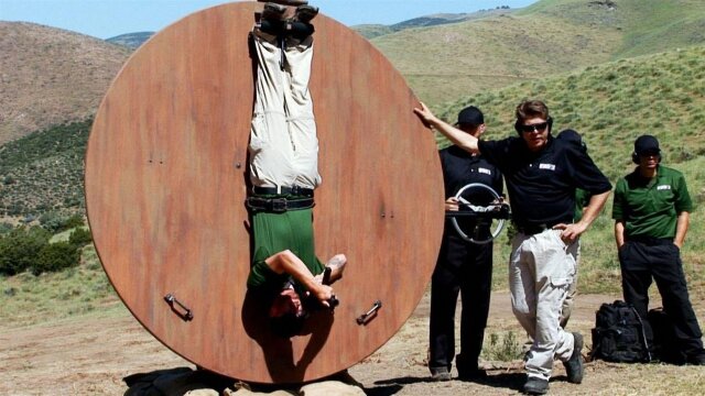 Shooters use the SP89 semi automatic pistol while moving through the air upside down; one competitor amazes the group with a stunning performance at the elimination challenge.