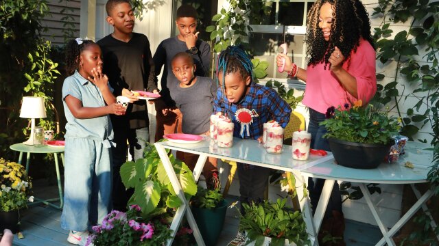 Tregaye throws a birthday party for Zaire, with a slider and brat bar, chili for the hot dogs, pimento cheese and peanut butter and strawberry shortcake jars.
