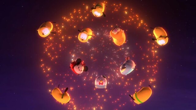 The Tsums try to reach the fireworks with their trampolines.