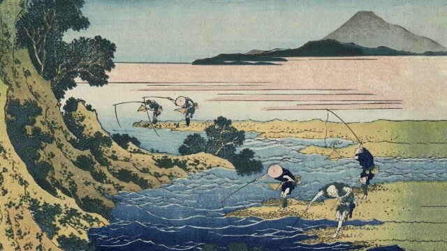 The host examines "Fly-fishing," a woodblock print by Japanese artist Katsushika Hokusai that features a group of anglers using drifting mosquito hooks to fish.