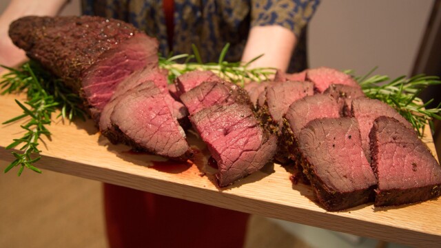 Sarah makes a trip to a prehistoric cave site; she hosts a barbecue party for her visiting family and new friends; prepares dry rubbed bison roast; BBQ beef and boar; farro and roasted vegetable salad, Bob's chimichurri sauce.