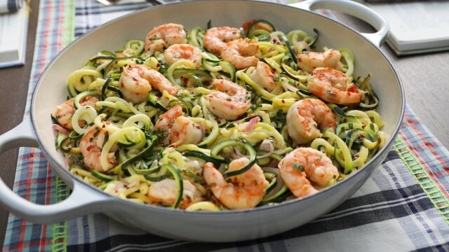 Valerie Bertinelli's book group is celebrating its 25th anniversary; Valerie makes antipasti skewers, shrimp scampi zoodles, herby snap peas salad and a one ingredient tangerine sorbet with a champagne topper.