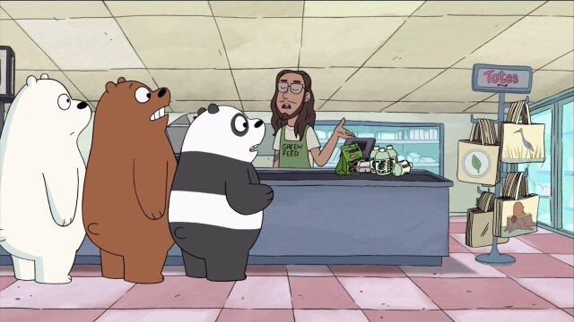 The Bears are shamed by a hipster grocery store worker when they ask for plastic grocery bags; the Bears quickly realize that eco-friendly tote bags are the way to go.