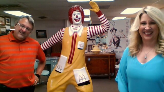 An old Ronald McDonald statue; a World War II diving helmet; maps.