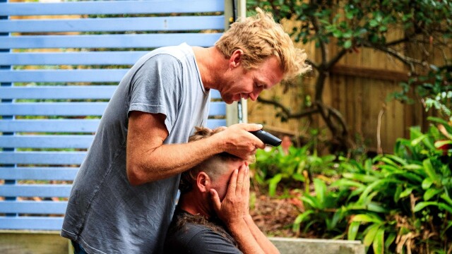 The crew gets into a ripping groove at the first proper surf spot along the Australian coast, but poor Poopies busts a fin on his shortboard; then, Jamie gives Poops a fresh haircut.