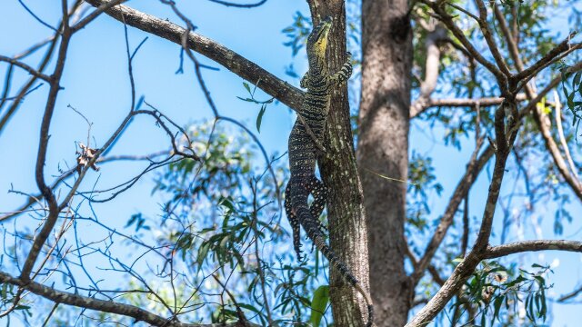 An injured goanna climbs high up a tree and a bird gets fancy footwear.