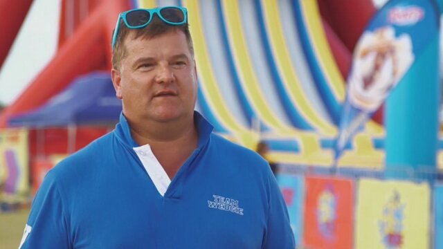 A teacher hits the vertical Boomerang in Indonesia while three friends get wet and wild surfing a 100-foot waterfall in Brazil; gym buddies take on a six-story inflatable waterslide in Australia.