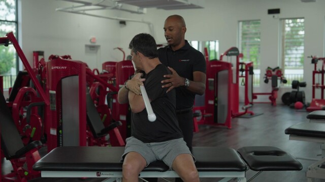Randall Hunt takes new client Roger Bassin through a 90-day program of unique exercises, high-tech analysis and swing instruction to alleviate neck issues.