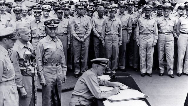 The four years of conflict during World War II between the United States and Japan begins after the Japanese bombing of the naval base at Pearl Harbor, Hawaii. Gen. Douglas MacArthur and Adm. Chester Nimitz pull Army and Naval forces together, leading to battles at Midway Island, defeats at Corregidor and rebounding American victories in Guadalcanal, the Leyte Gulf and the Philippines. The conflict continues across the Pacific Islands, leading to the destruction in Japan by the atomic bomb.