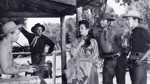 Randolph Scott, Nancy Gates, Claude Akins, Skip Homeier, Richard Rust, Rand Brooks, Dyke Johnson