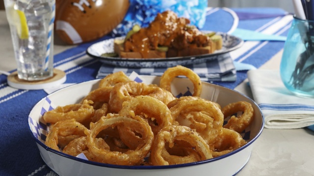 Kardea Brown serves her local college football team a winning lineup of chopped cheese sandwiches, colossal onion rings, hot Carolina chicken fingers, and apple pie hand pies with apple cider glaze.