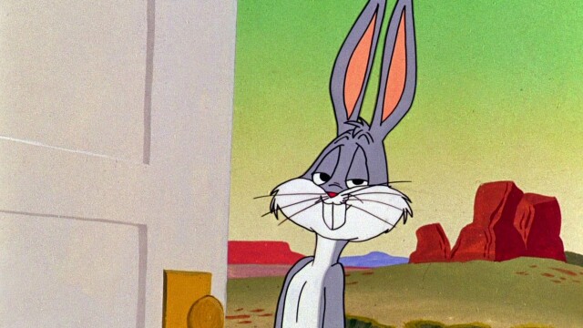 Wile E. Coyote sets up a contraption to capture Bugs Bunny (Mel Blanc).