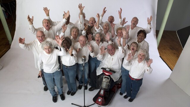 A group of senior citizens performs contemporary rock and pop songs.