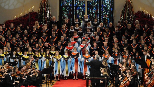 Choirs and instrumental ensembles perform traditional holiday music.