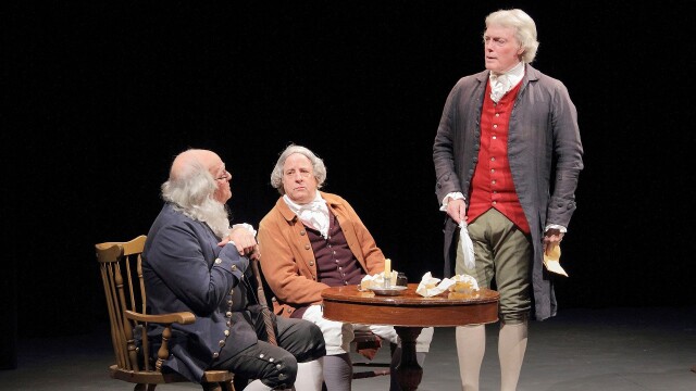 Thomas Jefferson (Bill Barker), Benjamin Franklin (John Hamant) and John Adams (Sam Goodyear) discuss events leading up to the Declaration of Independence, while John Dickinson (Rodney TeSlaa) explains the conflict behind the event; host Marc Baer.