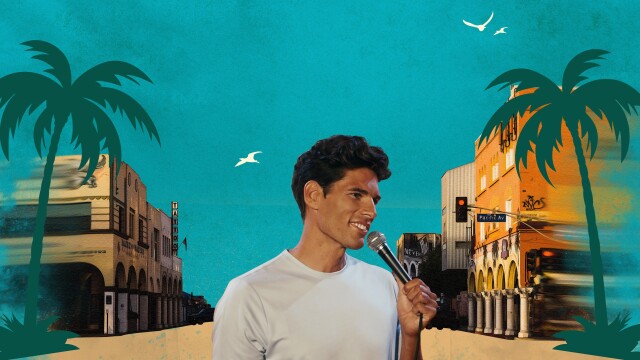 Lachlan Patterson performs stand-up comedy live at Venice beach.
