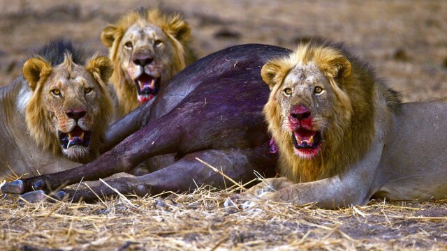 Competing prides of lions stalk their buffalo prey across a dry vista, each pride attempting to get the kill; only the most cunning and capable will survive.
