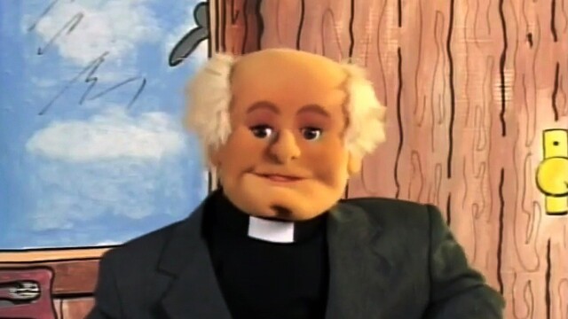 A puppet troupe play a group of children, a priest and a religious woman.