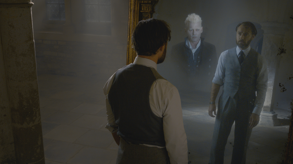 The preview then cuts to a quick shot of an even younger Dumbledore (Toby Regbo) peering at a younger Grindelwald (Jamie Campbell Bower) in the Mirror—both Rebgo and Campbell-Bower are reprising their roles from the Harry Potter and the Deathly Hallows movies—before Law’s Dumbledore is shown looking at a reflection of Johnny Depp’s Grindelwald.